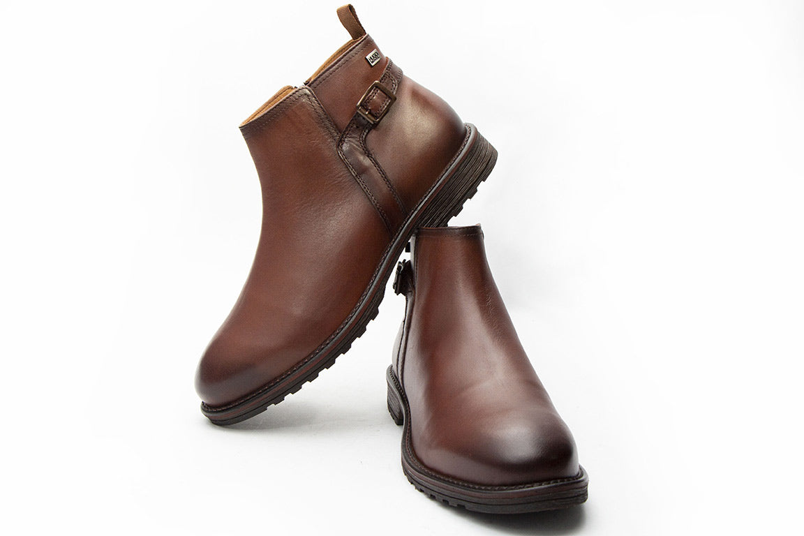 Bota Hugo Manuel produzida em pele anilina cognac. Parte interior composta por palmilha e forro em pele. Fecho de correr na lateral interior e fivela no lado exterior, marca em chapa também no lado exterior. Sola em TR, salto baixo de 3 cm, 1,5 cm de compensado e cerca de 9 cm de altura de cano.