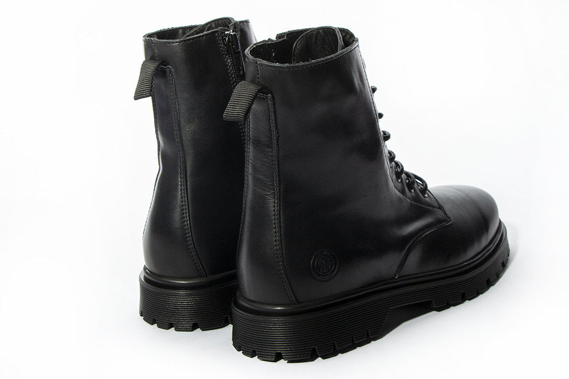 Bota preta estilo militar de pele com sola baixa. Possui palmilha acolchoada e sola de 4 cm. Fecho zíper lateral, cordões na parte frontal.